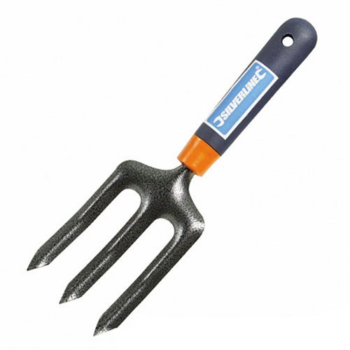 Fourche à fleurs robuste en acier épais à finition rugueuse et manche en polypropylène.