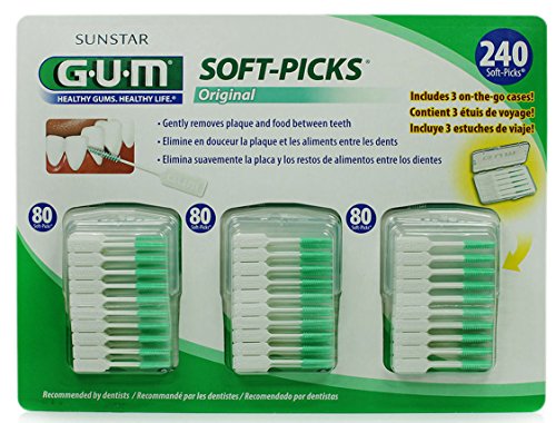 sunstar Gum Soft-Picks en cas de voyage pratique, 3 packs, 240 Picks sans vous encombrer, soft-pic KS brosses interdentaires sont doux, souples, formes biseautées qui permet de s'adapter aux espaces entre les dents pour éliminer les bactéries et les débris alimentaires autour de la marge gingivale. · Le pinceau est effilée pour s'adapter à différentes tailles de lacunes et cette valeur spéciale Pack contient régulier taille · ils sont parfaits pour les personnes ayant des problèmes de la soie dentaire difficile. Ils peuvent également être utilisés autour des implants et après remodelage gingival. · Les filaments semblable à du caoutchouc, facilement glisser entre les dents et masser doucement les gencives. Il y a pas de pièces métalliques dont certaines personnes trouvent rassurante.
