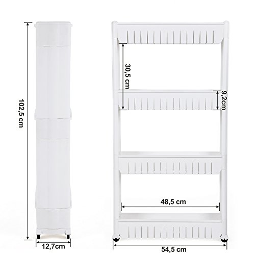 Songmics 4 étages Etagère de rangement, Armoires de cuisine, Chariot de stockage, Meuble de rangement à roulettes, Etagère de cuisine, salle de bains roulante 102,5cm avec Blanc KFR04W