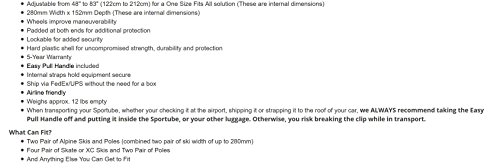 - Peut contenir 2 paire de skis alpins et bâtons ou 4 paires de skis nordiques/de fond et bâtons