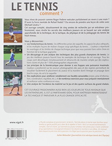 Vous rêvez de pouvoir comme Roger Federer exécuter parfaitement un revers à une main ? D'avoir la force mentale de Rafael Nadal ? Ou encore de prendre une leçon de volée avec Michaël Llodra ? Cet ouvrage complet, aboutissement de cinq années de recherche par un entraîneur professionnel, vous révèle les secrets des meilleurs joueurs en se basant sur une analyse approfondie de la technique, de la tactique, du physique et de la pédagogie du tennis de haut niveau. Vous y découvrirez : Les fondamentaux du tennis : les différentes prises de raquette, les appuis les plus adéquats, et les multiples façons de réaliser chaque coup spécifique du tennis... L'auteur a répertorié les avantages et les limites de chaque technique pour que vous puissiez faire votre choix en fonction de la tactique gagnante. Un décryptage et une analyse des techniques des plus grands champions de tennis. Le jeu des meilleurs joueurs fournit tous les exemples de technique de cet ouvrage. Tous les coups sont décortiqués minutieusement et retranscrits de manière simple par des explications claires et plus de 1 500 photographies séquencées. Les principes de la biomécanique pour donner à vos frappes une puissance maximale. L'auteur a positionné sur les joueurs photographiés des axes et des repères permettant de visualiser facilement le placement du joueur et la manière dont l'énergie se propage dans tout le corps, du sol à la raquette. Des explications pour améliorer notablement vos facultés sensorielles (vision, prise d'information, coordination, équilibre, etc.), et de nombreux exercices pour vous préparer mentalement et renforcer votre confiance en vous. Une analyse de l'incidence du matériel sur le jeu et des quatre surfaces du grand chelem.