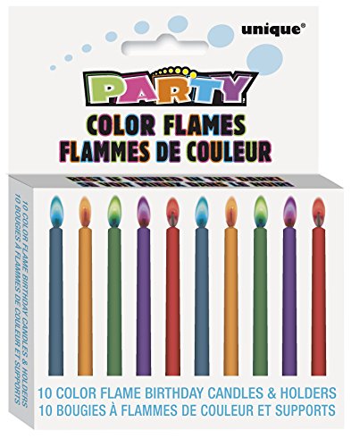 Unique Industries-Birthday Candles & Holders: Color Flame. A fun addition to any birthday party! This package contains ten 2 inch birthday candles and ten holders. WARNING: To Prevent Fire- keep burning candle within sight. Not recommended for children under 3 years. Imported.