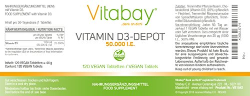 - BEAUCOUP D'AVANTAGES - EFFET DEPOT avec 50 000 I.E. Dose de 50 jours -> 1000 I.E. par jour. Un comprimé vous fournit notre vitamine D3 de haute qualité pendant 50 jours. Cela peut contenir 120 comprimés végétaliens.