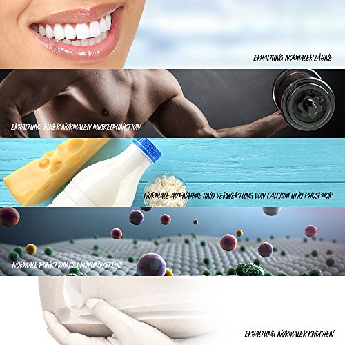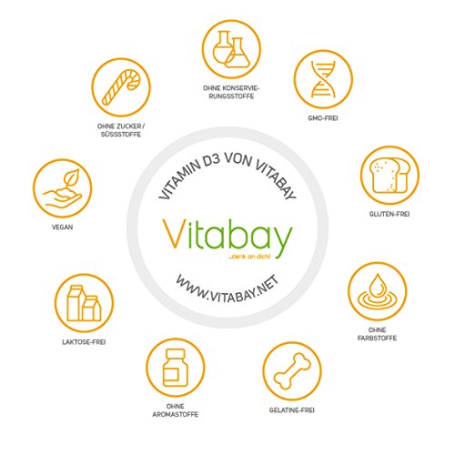 - SUPPLÉMENT ALIMENTAIRE À HAUTE DOSE - En tant que produit 100% végétalien, la vitamine D3 de Vitabay aide à maintenir des os normaux, une fonction musculaire normale, des dents normales et une fonction immunitaire normale. En outre, il a une fonction dans la division cellulaire. Il contribue également à l'absorption et à l'utilisation normales du calcium et du phosphore.