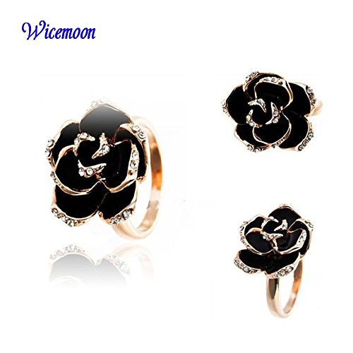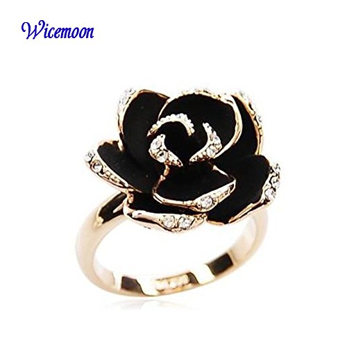 Wicemoon Bague fleur rose noire fantaisie plaqué Or Solitaires en Strass et Email noir original pour Femme comme Cadeau de Noël Anniversaire Mariage